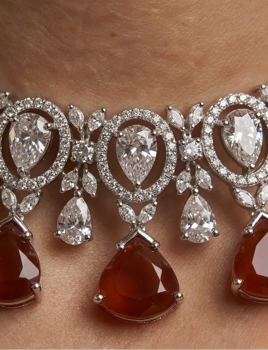 Introducing our enchanting grey studded CZ necklace and earrings set, elegantly crafted in an oval shape design. Made with meticulous attention to detail, this set showcases stunning grey hues that exude sophistication. The coordinating earrings perfectly complement the necklace, adding to its allure.