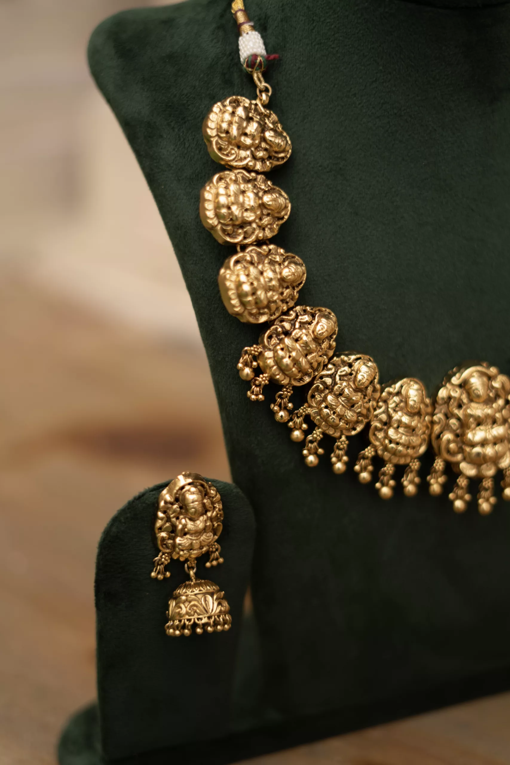 Discover our exquisite Gold-Plated Necklace adorned with intricate designs and delicate zhumkis. Crafted with high-quality, this necklace features a striking layer of large Laxmi designs intertwined with zhumkis, this necklace exudes sophistication and elegance. Elevate your ensemble with its