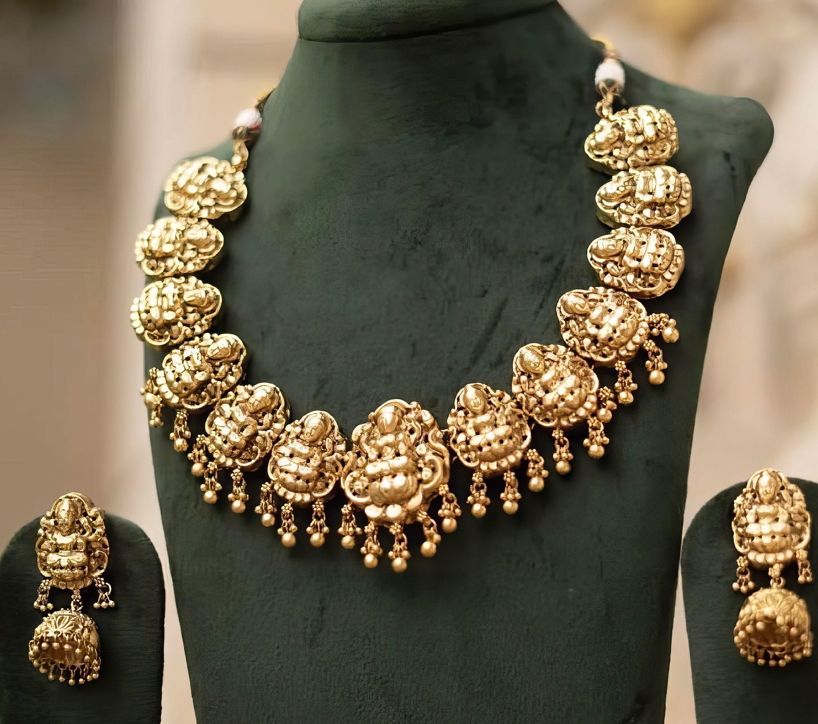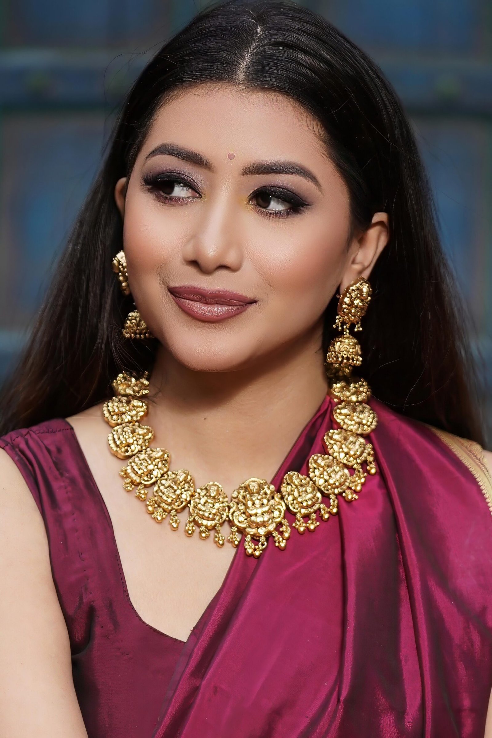 This Temple Jewelry Set is perfect for weddings, festivals like Diwali and Navratri, and cultural events, adding a touch of tradition and elegance to your ensemble. Its intricate Laxmi designs make it ideal for special family gatherings and cultural performances, embodying the timeless beauty of Indian craftsmanship. Versatile yet divine, it elevates both formal occasions and casual outings with its resplendent charm.
