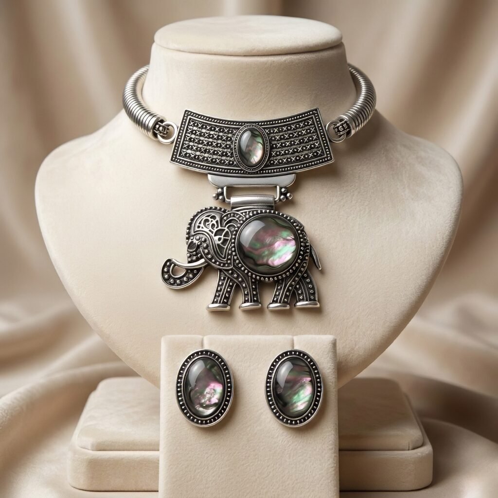 Celebrate heritage with a modern twist through this Elephant Charm Jewelry Set, featuring a bold silver-toned necklace and matching stud earrings. The necklace showcases a coiled chain with a rectangular pendant etched in crosshatch and dot patterns, centered by a luminous iridescent stone. Suspended below is a finely detailed elephant charm, also adorned with a shimmering stone that reflects hues of green, blue, and violet. The coordinating earrings mirror this elegance with oval-shaped studs framed in beaded silver detailing. Crafted from durable alloy, this set blends cultural symbolism with contemporary artistry—perfect for women who value meaningful design and standout style.