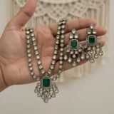 Introducing our exquisite double layer necklace set featuring semi-precious emerald and Moissanite Polki stones. This exquisite set features a captivating double-layered necklace adorned with vibrant emerald and Moissanite Polkis. Embrace luxury and style with this stunning jewelry ensemble.