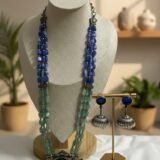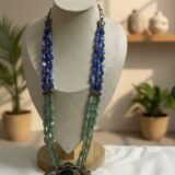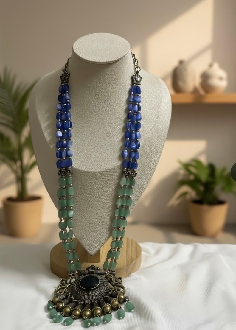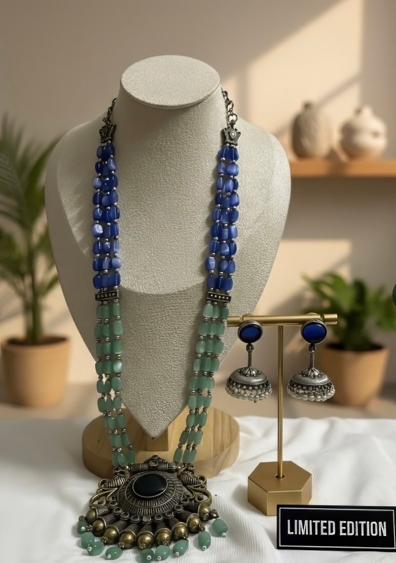 Step into the world of heritage and grandeur with our Mystic Royalty jewelry set, a breathtaking fusion of tradition and elegance. This handcrafted dual-tone beaded necklace showcases mesmerizing shades of royal blue and sea green, harmoniously blended with oxidized silver and antique gold accents. The statement pendant, featuring intricate metalwork and a deep-hued center stone, enhances its regal charm. Complementing the necklace, the oxidized silver jhumkas with deep blue stones complete the look with a classic ethnic touch.
