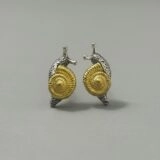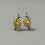 A striking close-up showcases a uniquely designed earring shaped like a snail, worn on a person’s ear. The earring features a golden spiral shell paired with a silver-toned body that elegantly curves outward, mimicking the natural form of a snail. The soft blur of the background enhances the visual focus on the earring’s intricate craftsmanship and organic silhouette. This imaginative piece blends artistic flair with wearable fashion, making it a standout accessory for those who appreciate nature-inspired jewelry with a touch of whimsy.