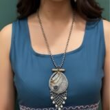 Suspended from a beaded chain, the pendant is complemented by coordinated earrings that mirror its design, complete with dangling pearl drops for graceful movement. Ideal for ethnic wear, festive occasions, or cultural events, this set reflects heritage craftsmanship with a bold, artisanal finish.