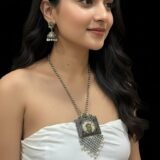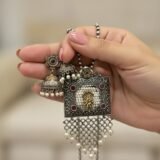 The pendant is suspended from a metallic beaded chain and finished with a decorative fringe of oxidised mesh, adorned with hanging white pearls. This piece reflects cultural craftsmanship and is ideal for pairing with traditional attire during festive occasions, folk events, or heritage celebrations.