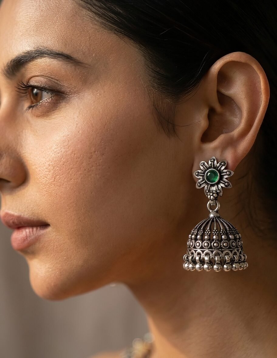 Discover the allure of our Silver 925 Oxidized Jhumkis. Handcrafted to perfection, these earrings showcase the timeless beauty of oxidized silver, exuding a unique charm and character. The intricate design features a captivating floral motif, adding a touch of elegance to any outfit.