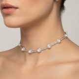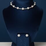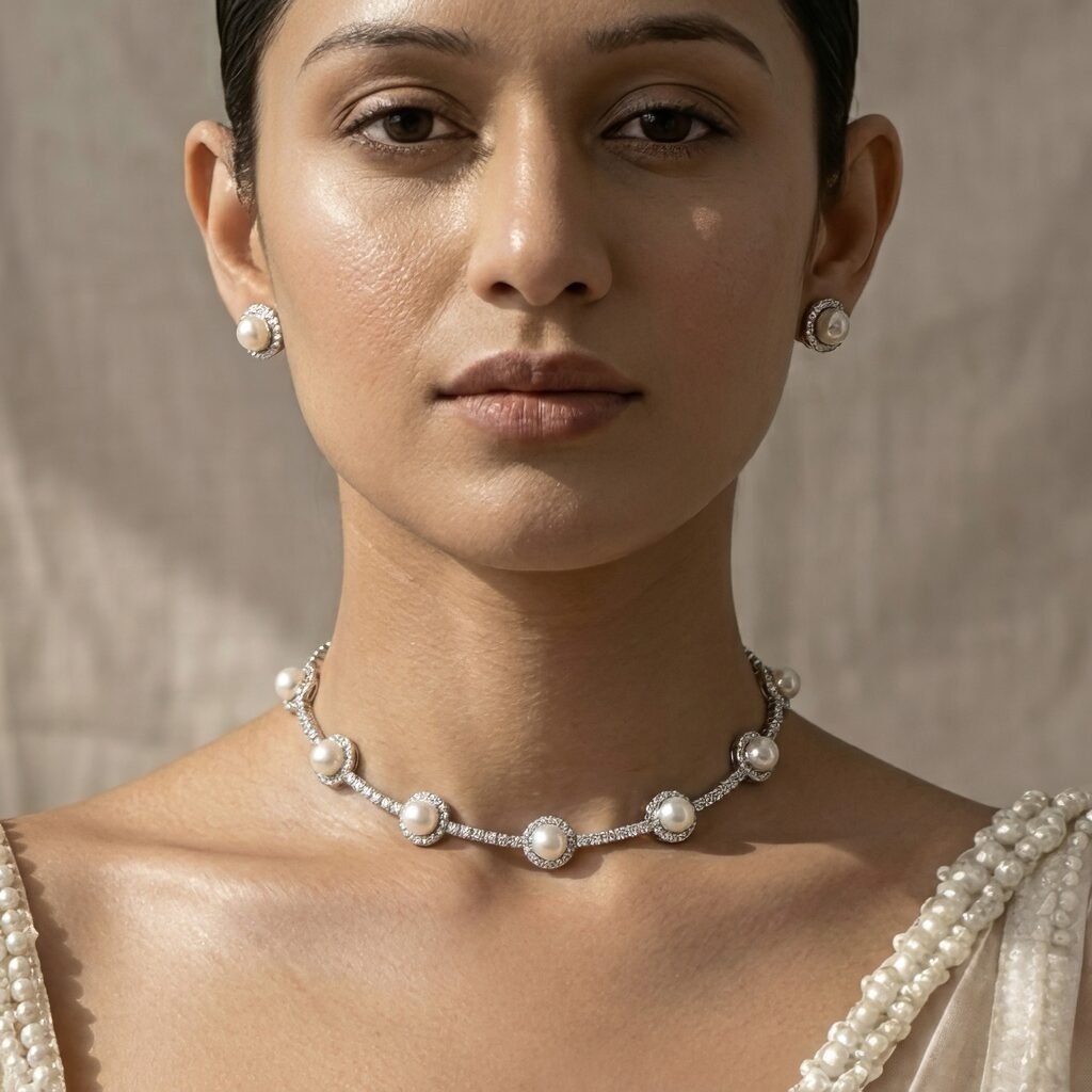 This elegant jewelry set features a timeless combination of white pearls and sparkling halo accents, crafted in a polished silver-toned alloy. The choker is designed with evenly spaced pearls, each encircled by a delicate frame of clear stones that add brilliance and definition. Suspended from a fine chain with an adjustable clasp, the necklace offers flexibility in length, making it suitable for varied necklines and styling preferences.