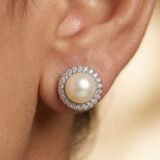 The matching earrings mirror the chokers refined aesthetic, each showcasing a single pearl surrounded by a halo of shimmering stones. Their compact yet radiant design makes them ideal for both day and evening wear, offering understated luxury with a classic silhouette.