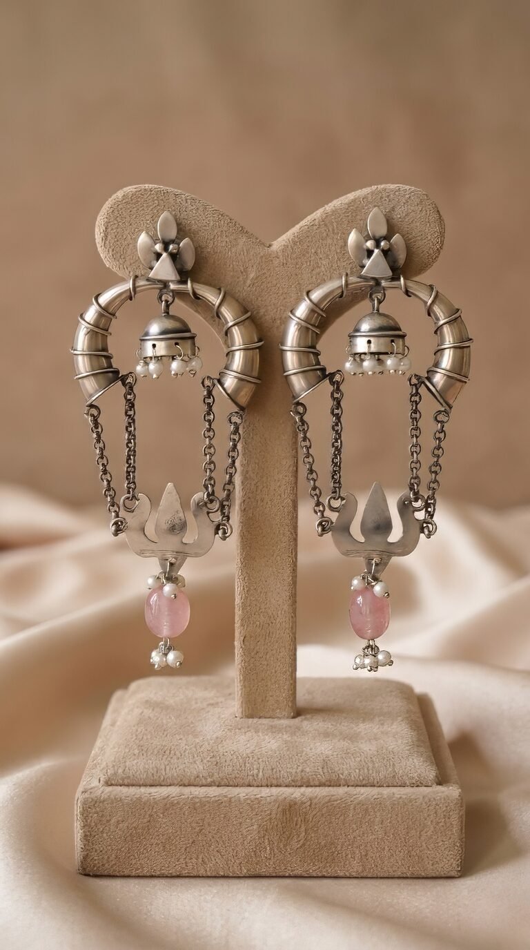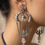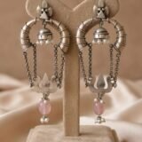 Silver 925 with semi precious pink stone and a chain hanging from it. The design is simple and elegant, with the pink stone adding a pop of color to the piece. The chain hanging from the center of the piece, giving it a delicate and feminine look. The design is minimalist and would be perfect for everyday