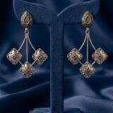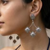 Crafted in 925 sterling silver, these Amrapali-inspired geometric drop earrings bring together heritage artistry and modern statement styling. Designed with an oxidised silver finish, intricate engraved detailing, and suspended diamond-shaped motifs, this pair creates a bold yet refined silhouette.