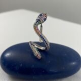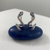 These bold and artistic earrings are designed in a coiled snake silhouette, capturing the fluidity and mystique of serpentine forms. Each earring features a raised head and curved body, meticulously adorned with multicolor enamel work in rich tones of green, blue, red, and purple. The enamel detailing mimics the shimmer of gemstones while offering a lightweight, contemporary finish that’s ideal for expressive styling.