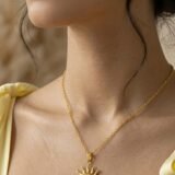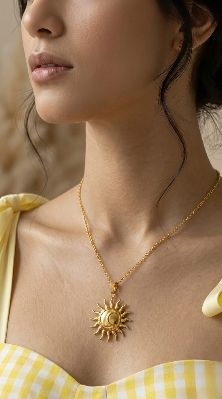 Radiating warmth and elegance, this gold necklace features a striking celestial pendant that unites the sun and crescent moon in a harmonious embrace. The sun’s sculpted rays frame a smooth, polished surface, while the moon nestled within adds a touch of mystique and balance. Worn with a cream off-shoulder top, the piece evokes both serenity and strength—ideal for those drawn to symbolic jewelry that celebrates cosmic beauty and inner light.