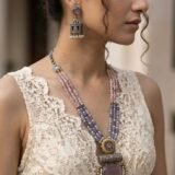 Unveil a royal touch of artistry with this exquisite handcrafted dual-tone beaded necklace set, featuring a harmonious blend of lavender and pink-hued beads, accentuated with delicate pearls. This mesmerizing design is further enhanced by an antique-inspired oxidized silver pendant, evoking an aura of vintage charm.