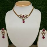 – Earrings Design: The earrings mirror the choker’s design, featuring a harmonious blend of kundan stones and a central red gemstone. The drop design adds a subtle movement and grace to the earrings, creating a perfect match to the choker.