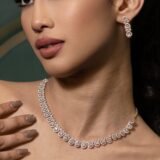 This jewelry set comprises a single-layer necklace adorned with pearl-shaped diamond CZ stones, elevating its elegance and sophistication. The matching earrings beautifully complement the necklace design, rendering it an ideal accessory