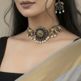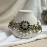 Designed with oxidized silver and gold-tone elements, this choker features a bold floral central pendant adorned with black stone detailing and delicate engravings. The pendant is framed by majestic gold-tone elephants, each embellished with intricate carvings that showcase expert craftsmanship. Dangling pearl embellishments add a graceful touch, making this piece perfect for grand occasions. The adjustable black thread closure ensures a comfortable fit, allowing you to style it effortlessly with ethnic and Indo-western outfits.