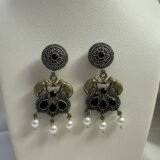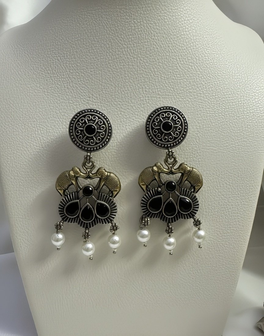 The matching statement earrings feature a round oxidized silver stud with a beautifully detailed pattern, leading to gold-tone twin elephants holding a stunning black stone centerpiece. The pearl drops complete the regal look, adding a touch of femininity and tradition.