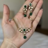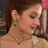 Elevate your style with this opulent green and gold necklace set, crafted to perfection with intricate detailing and luxurious design elements. The necklace features dazzling gold-toned petals adorned with Kundan-inspired embellishments, complemented by vibrant green stones that exude sophistication. Its timeless charm is enhanced by the delicate matching earrings, making it an ideal choice for weddings, festive occasions, and elegant soirées. The necklace sits beautifully on your collarbone, while the earrings add a subtle yet impactful touch to complete your ensemble