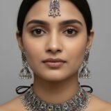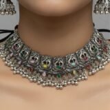 Together, the choker, jhumkas, and maang tikka create a regal composition—perfect for weddings, festive occasions, and cultural celebrations. The blend of silver tones, Kundan artistry, vibrant stones, and pearl accents ensures this set stands out as a timeless statement of elegance and tradition.