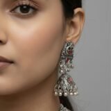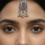 The matching jhumka earrings are equally ornate, showcasing finely detailed silver craftsmanship with radiant red stones and a cascade of pearl-like beads that sway elegantly with movement. Completing the ensemble, the maang tikka rests gracefully at the center parting, embellished with red and white stones that harmonize with the set’s overall palette.