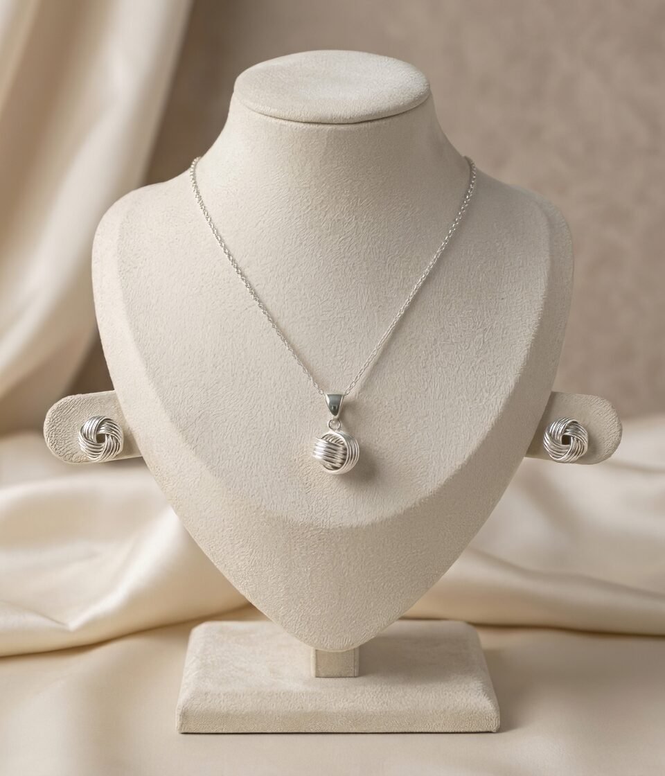 This elegant jewelry set features a handcrafted silver pendant paired with matching earrings, both showcasing a distinctive textured ball motif. The pendant, designed as a woven sphere, is suspended from a sleek silver chain that highlights its artisanal detailing and refined finish. Its subtle yet striking form makes it suitable for both everyday wear and special occasions .