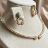 Make a bold yet sophisticated statement with this sleek open choker necklace set, encrusted with shimmering crystals and accented with pear-shaped designs on both ends. Paired with elegant circular stud earrings featuring crystal detailing and floral-inspired accents, this set is perfect for modern minimalists who love a touch of sparkle.