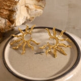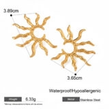 Illuminate your look with these radiant sun-shaped earrings, crafted from high-quality gold-colored stainless steel. Each earring features a sculptural sunburst design with wavy rays encircling a central open disc, evoking warmth, vitality, and celestial charm. The asymmetrical sizing—3.89 cm and 3.65 cm—adds a subtle artistic edge, while the polished finish enhances their visual impact.