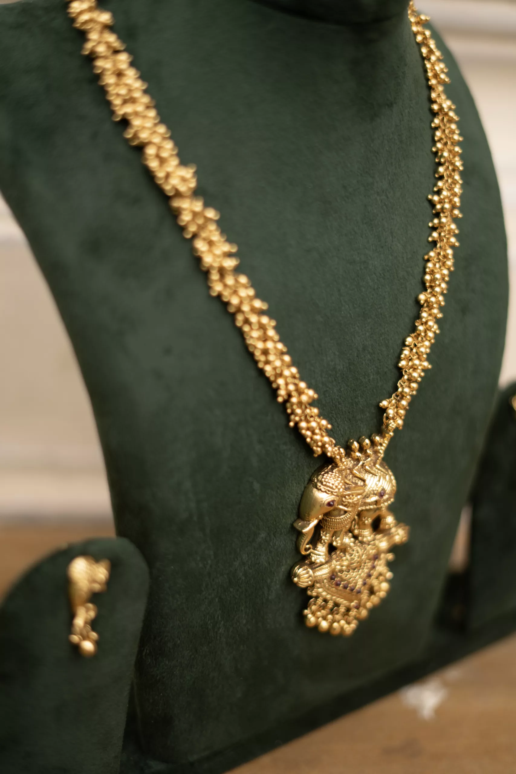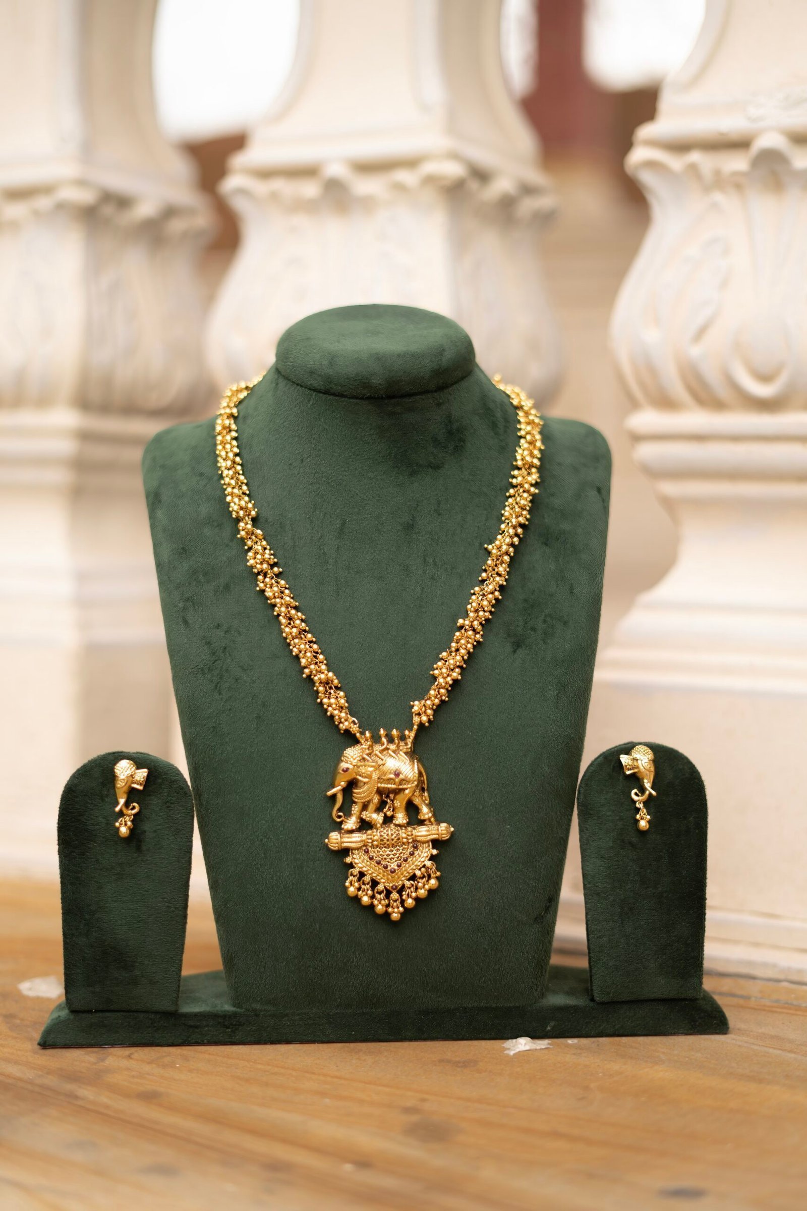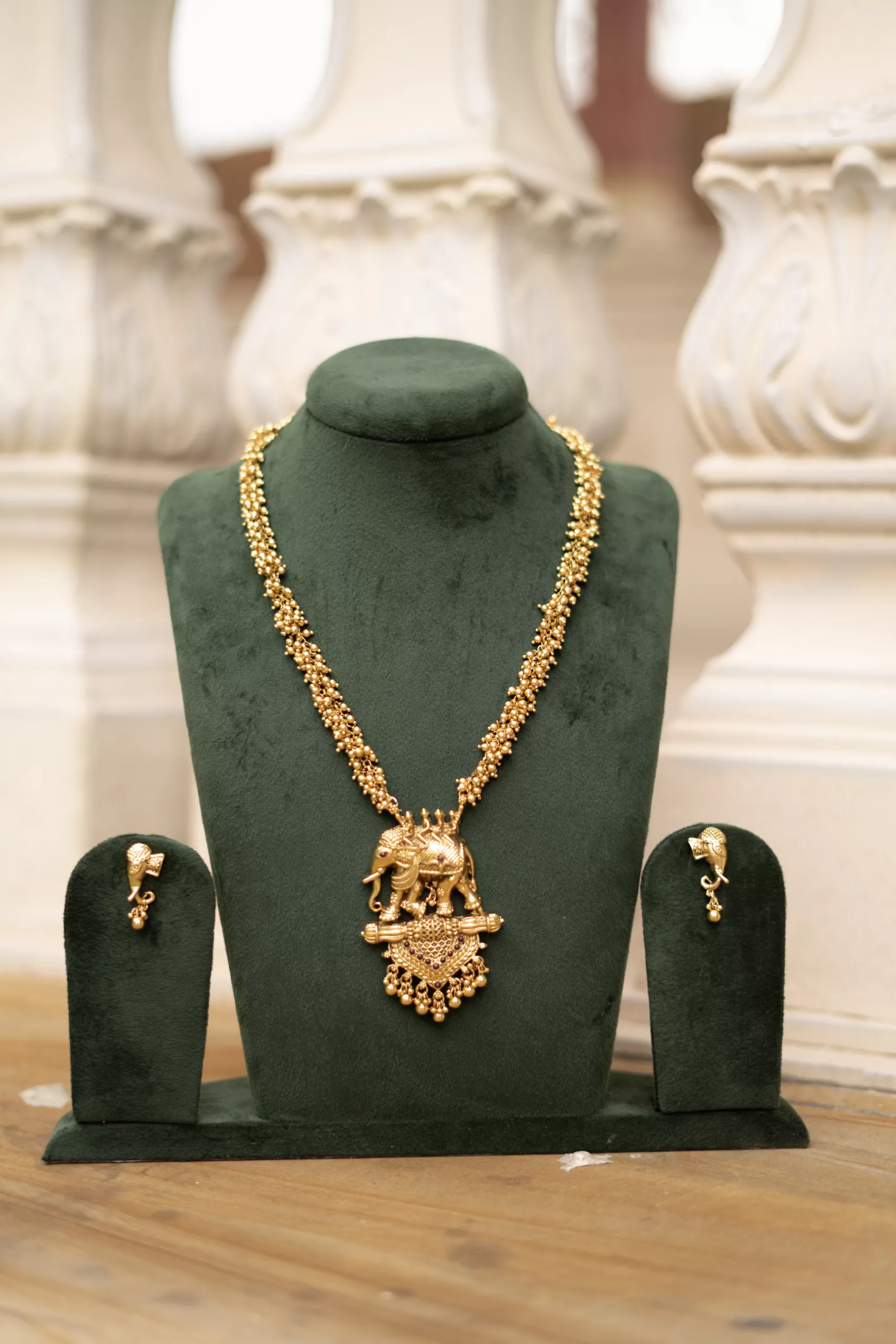 This exquisite gold necklace features an intricate temple-inspired design with a finely crafted elephant motif. The elephant is depicted in a standing position, showcasing its majestic presence and strength. The necklace is made of high-quality gold and includes a long chain that drapes elegantly around the neck. The detailed craftsmanship and traditional styling make this necklace a unique and beautiful piece of jewelry.