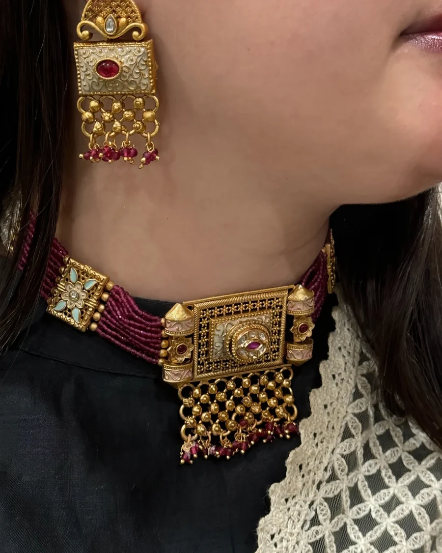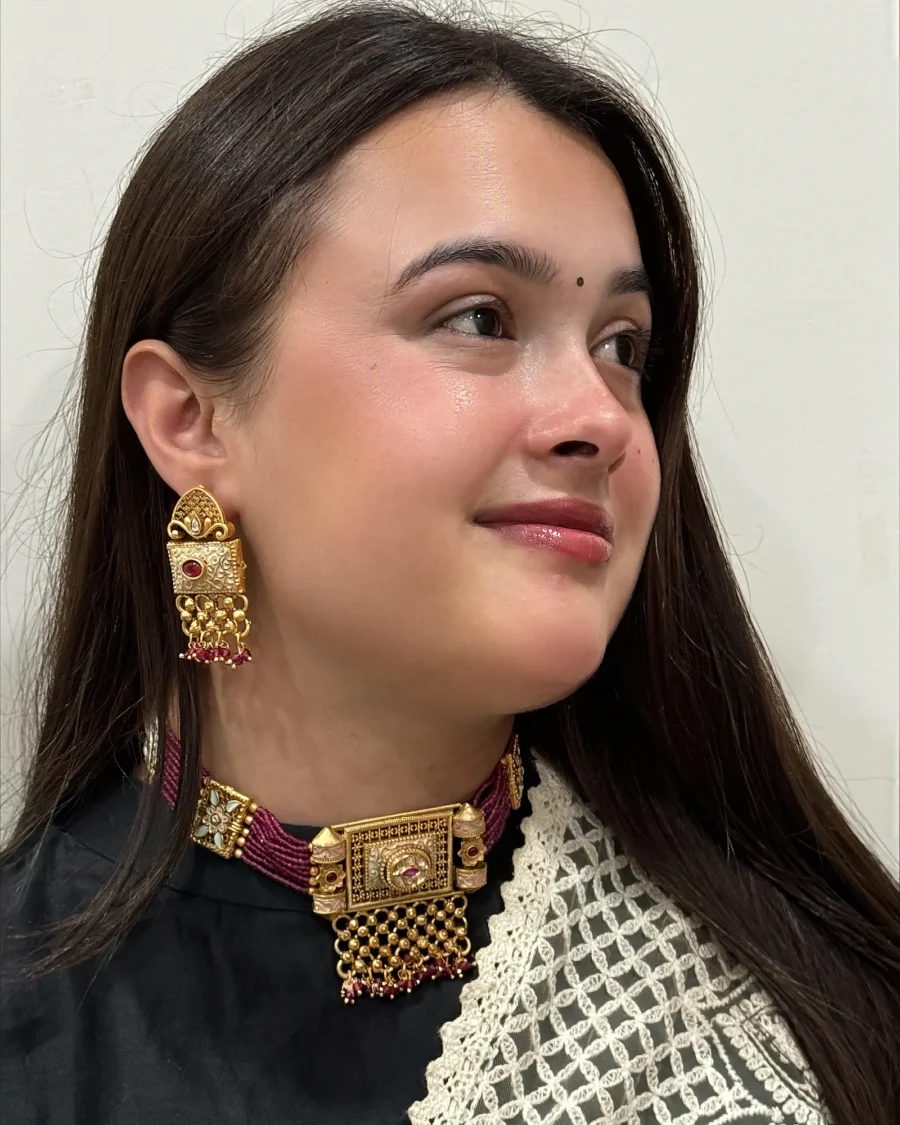 - Dangling Ruby Beads & Pearl Detailing for a majestic touch
