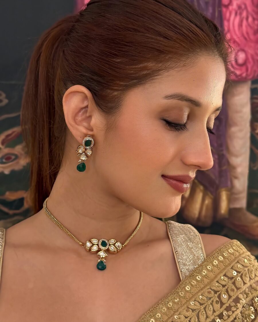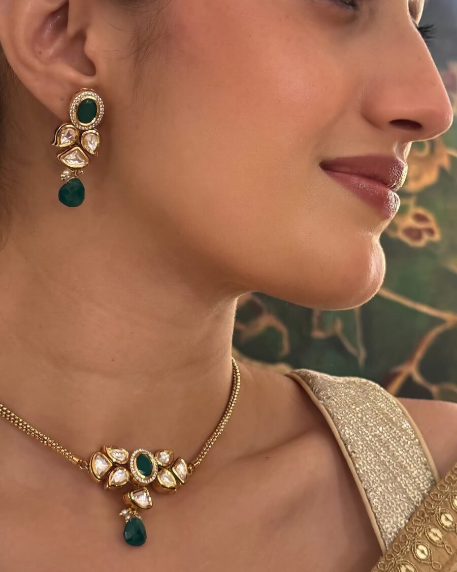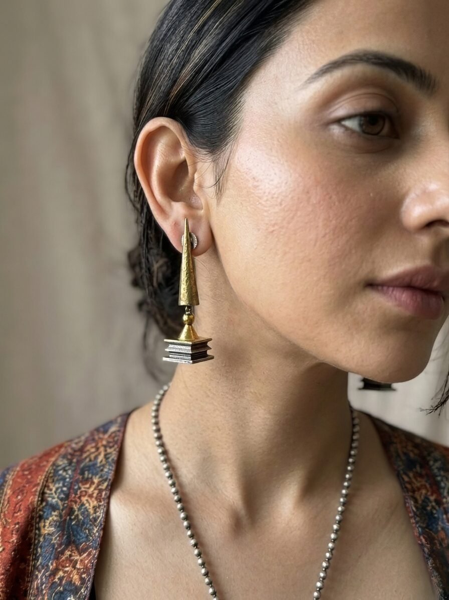 Complementing the necklace are uniquely crafted temple-inspired earrings, featuring a traditional tapering design with miniature temple domes, adding a touch of architectural elegance to this divine ensemble.