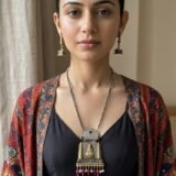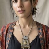 Step into the world of sacred elegance with this Temple-Inspired Oxidized Silver Goddess Lakshmi Necklace Set, a breathtaking piece embodying tradition and spirituality. The grand oxidized silver and antique gold-tone pendant features a meticulously crafted Goddess Lakshmi motif, symbolizing prosperity and divine blessings.