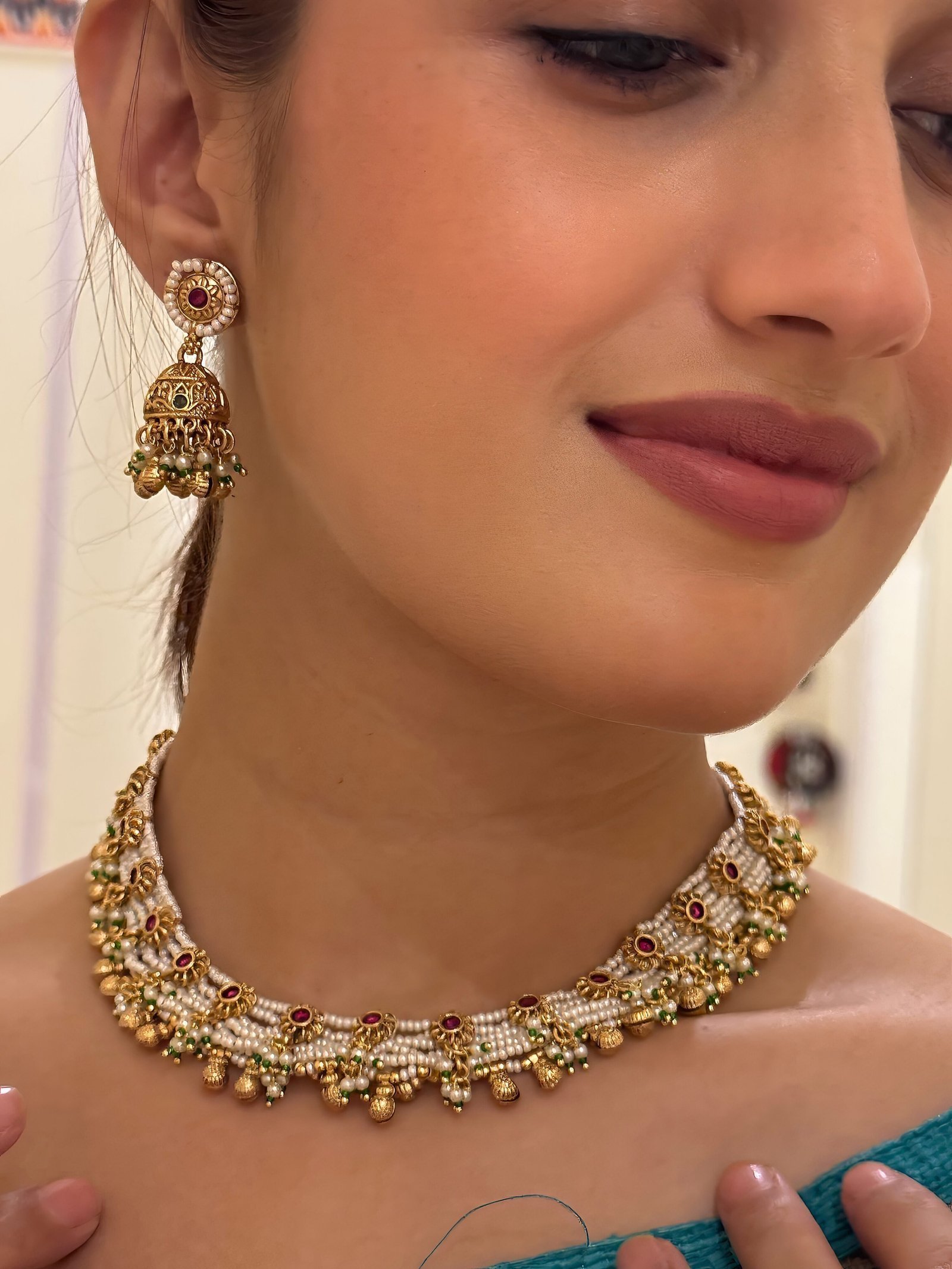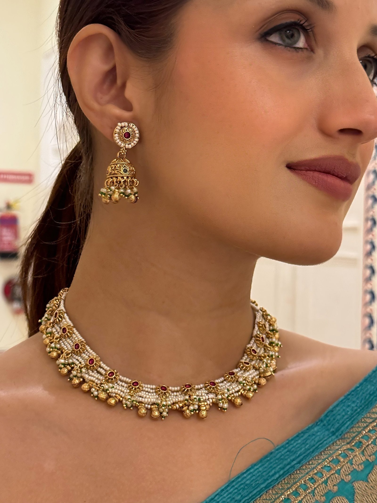 A stunning blend of white pearls arranged in a detailed pattern, adorned with colored stones and golden beads, adding a regal charm to your neckline. - Statement Earrings: