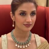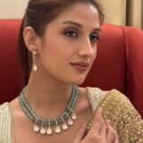 Enhance the beauty of this necklace by pairing it with an embroidered pastel saree, a shimmering organza outfit, or a light-toned Anarkali for a graceful traditional look. For contemporary events, style it with a satin gown in neutral shades like beige, mint green, or champagne. Keep your makeup soft and glowing with peachy tones and a hint of shimmer. A sleek updo or a neatly styled ponytail will showcase the necklace and earrings beautifully, ensuring all eyes are on you.”