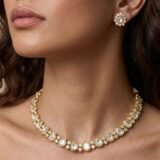 The matching earrings reflect the same design language, with a central teardrop-shaped stone surrounded by smaller round stones in a floral-inspired pattern. The set is ideal for weddings, festive occasions, or cultural celebrations, offering timeless appeal and refined craftsmanship.