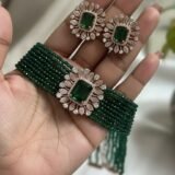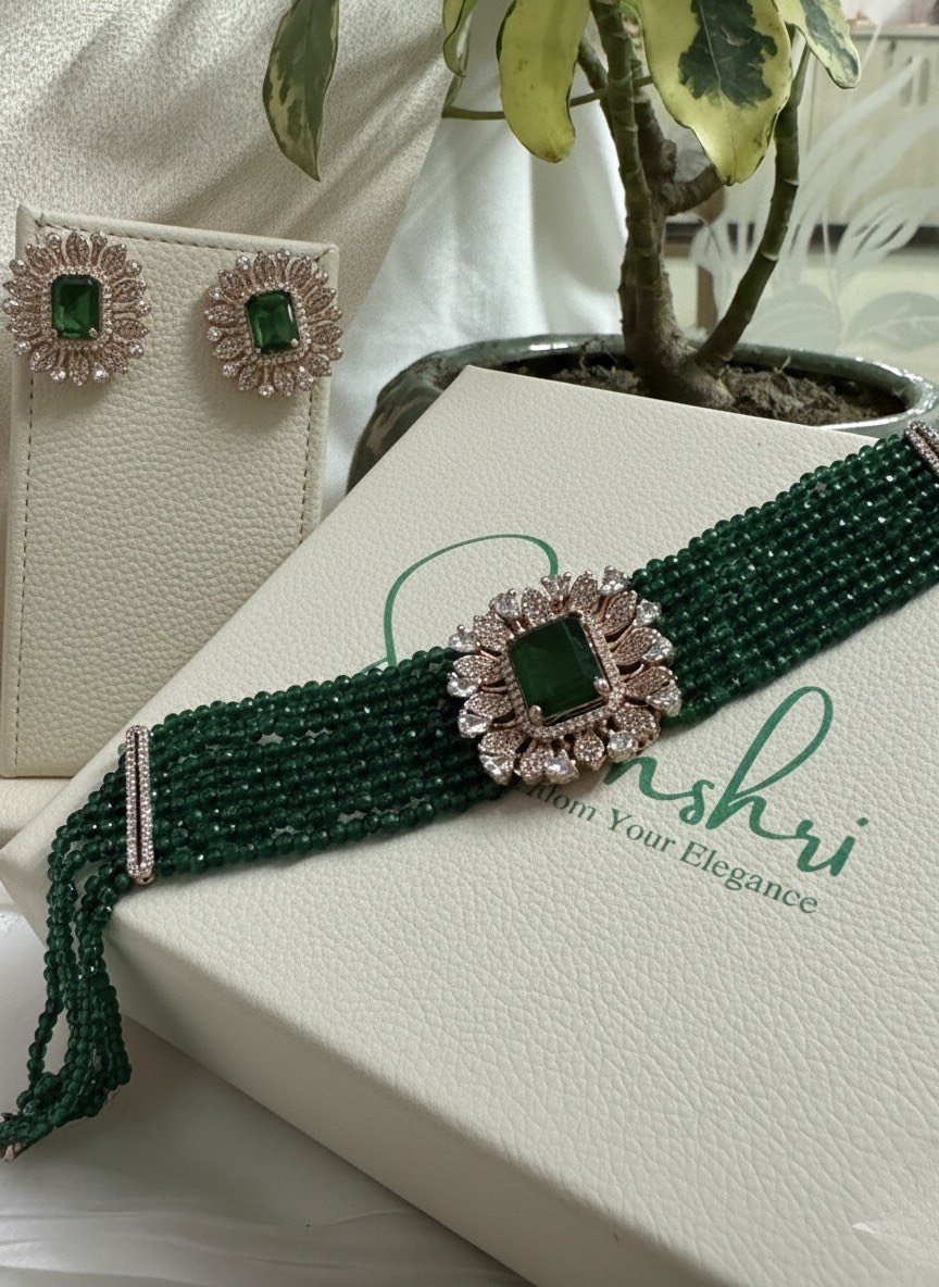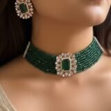 The necklace features a beautiful string of timeless, green-colored beads, each carefully chosen for their rich hue and timeless appeal. The beads are interspersed with delicate gold accents, creating a harmonious blend of colors and textures. This stunning piece features a central, large green stone that exudes elegance and sophistication and serves as a focal point of the design. Pair it with our matching earrings to complete your look and elevate your style to new heights