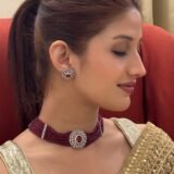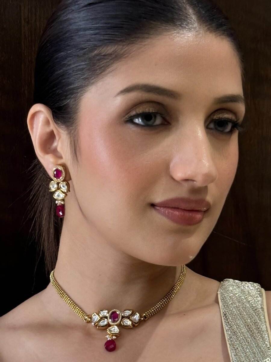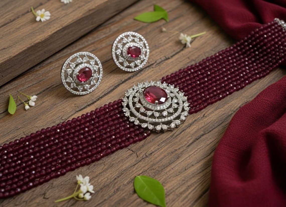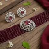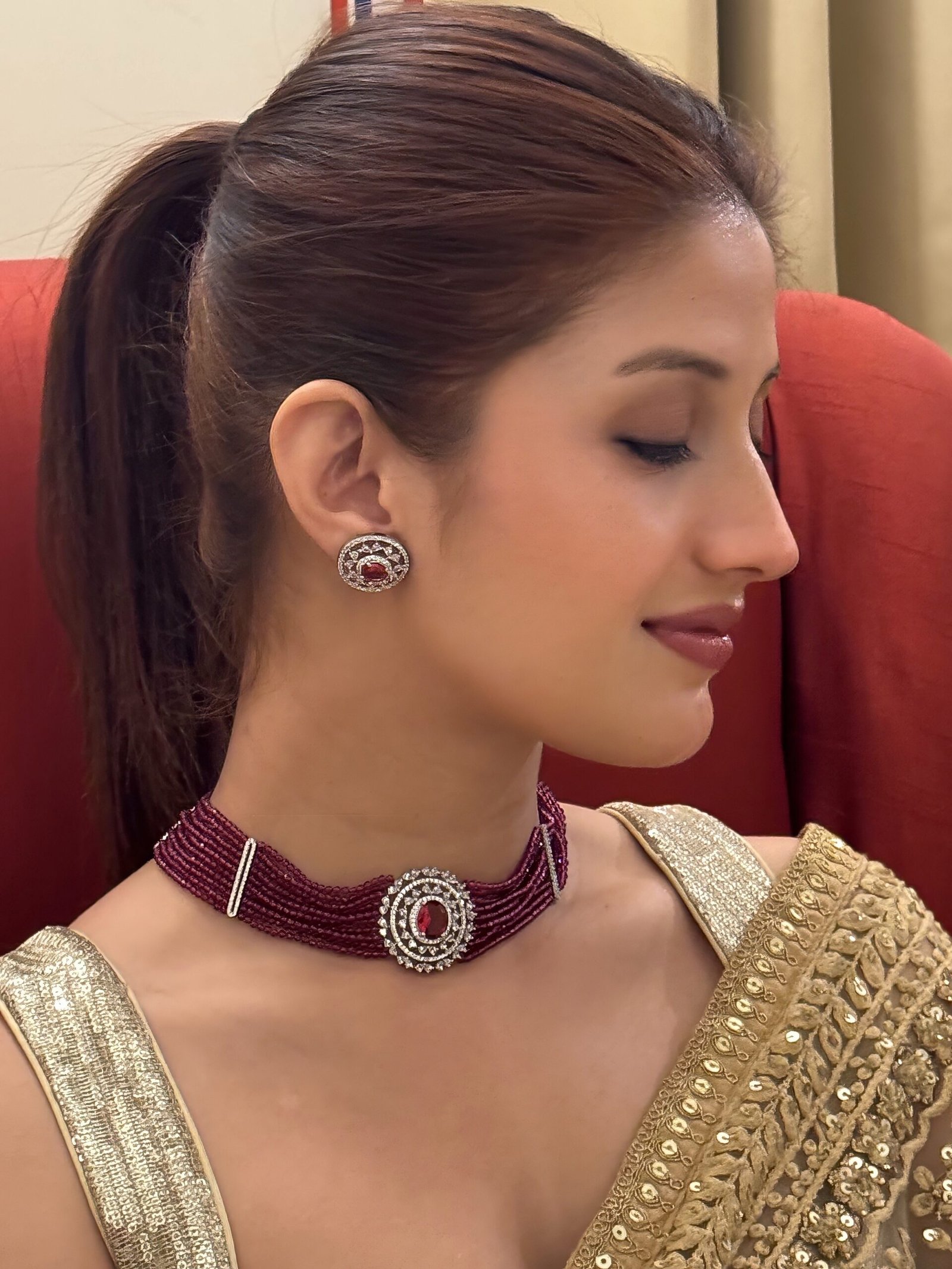 Enhance your elegance with our stunning mehroon choker featuring a captivating large mehroon stone at its center, exquisitely complemented by small diamonds on either side. Crafted with precision and style, our beaded choker is the perfect accessory to elevate any ensemble. Pair it with your favorite outfit for a touch of sophistication. Complete your look with our carefully curated collection of accessories.